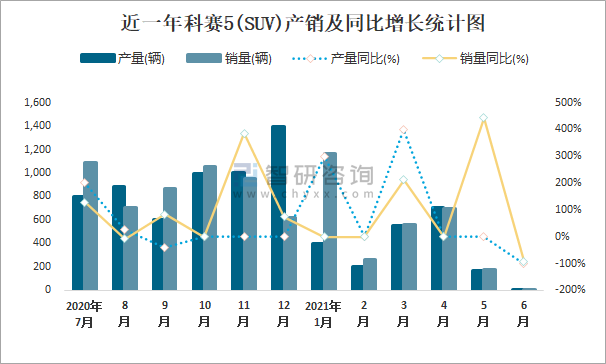 根據中國汽車工業協會數據可知:2021年6月科賽5(SUV)產量為6輛,同比下降98.7%,銷量為6輛,同比下降90.8%,當月產銷率為100%;2021年上半年科賽5(SUV)產量為2031輛,同比增長160.1%,銷量為2858輛,同比下降0%,產銷率為140.72%;2019-2020年科賽5(SUV)產銷量大幅度增加,且近2年總產量大于總銷量,積壓了庫存881輛。