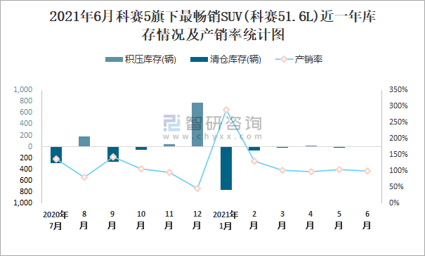 2021年6月科賽5旗下最暢銷SUV(科賽51.6L)近一年庫存情況及產銷率統計圖