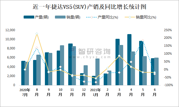 近一年捷達VS5(SUV)產銷及同比增長統計圖
