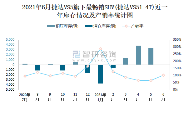 2021年6月捷達VS5旗下最暢銷SUV(捷達VS51.4T)近一年庫存情況及產銷率統計圖