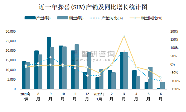 根據(jù)中國(guó)汽車工業(yè)協(xié)會(huì)數(shù)據(jù)可知:2021年6月探岳(SUV)產(chǎn)量為493輛,同比下降97.8%,銷量為3710輛,同比下降77.8%,當(dāng)月產(chǎn)銷率為752.54%;2021年上半年探岳(SUV)產(chǎn)量為48685輛,同比下降40%,銷量為60360輛,同比下降14.2%,產(chǎn)銷率為123.98%;2018-2020年探岳(SUV)產(chǎn)銷量逐年遞增,且近3年總產(chǎn)量大于總銷量,積壓了庫存12779輛。