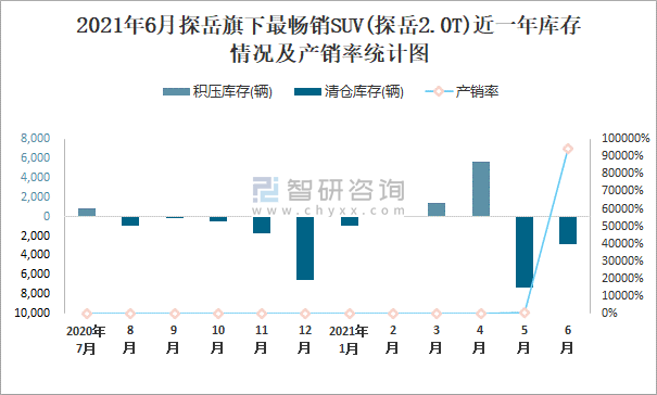 2021年6月探岳旗下最暢銷SUV(探岳2.0T)近一年庫存情況及產(chǎn)銷率統(tǒng)計(jì)圖