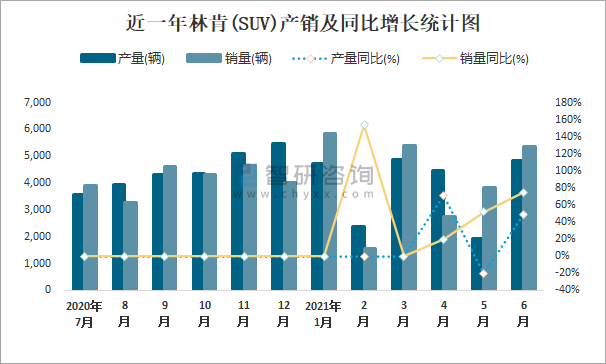 根據中國汽車工業協會數據可知:2021年6月林肯(SUV)產量為4846輛,同比增長48.6%,銷量為5345輛,同比增長74.7%,當月產銷率為110.3%;2021年上半年林肯(SUV)產量為23241輛,同比增長161.7%,銷量為24766輛,同比增長176.6%,產銷率為106.56%;2019-2020年林肯(SUV)產銷量大幅度增加,且近2年總產量大于總銷量,積壓了庫存2486輛。