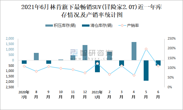 2021年6月林肯旗下最暢銷SUV(冒險家2.0T)近一年庫存情況及產銷率統計圖