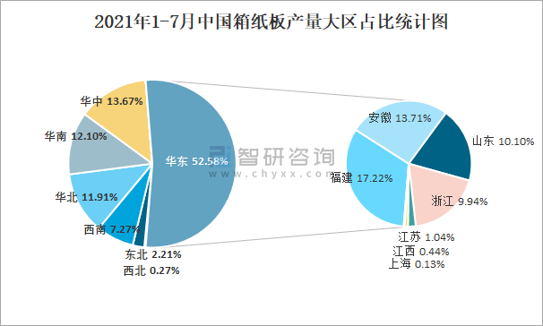 2021年1-7月中國箱紙板產量大區占比統計圖