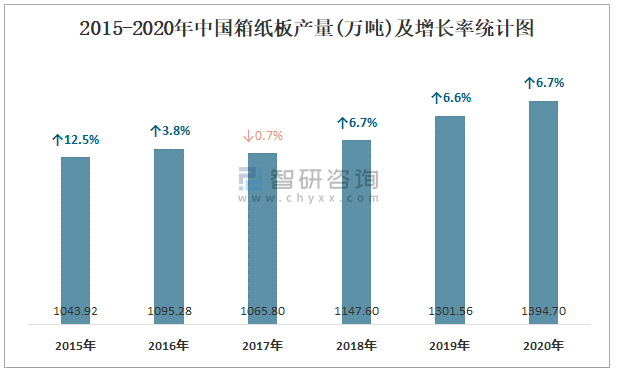 2015-2020年中國箱紙板產量及增長率統計圖