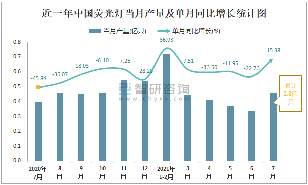 根據國家統計局數據顯示:2021年7月中國熒光燈產量為0.5億只,同比增長15.38%;2021年1-7月中國熒光燈累計產量為2.8億只,同比增長4.16%;2015-2020年中國熒光燈產量2015年達到最高,此后逐年遞減。