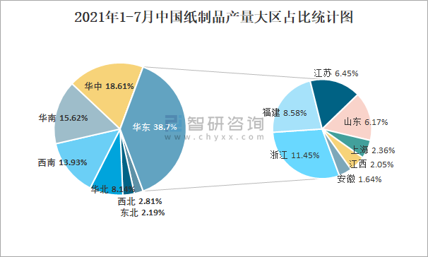 2021年1-7月中國紙制品產量大區占比統計圖
