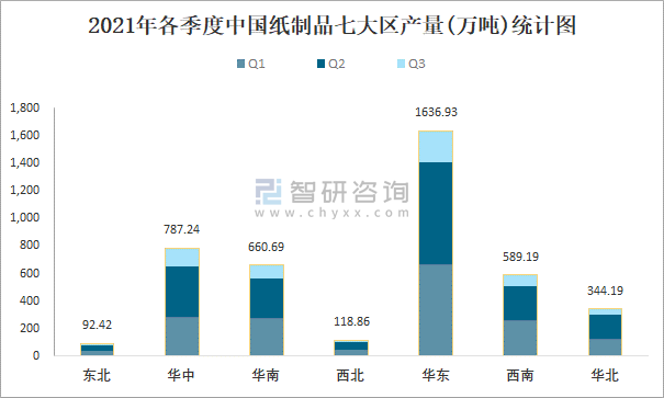 2021年各季度中國紙制品七大區產量統計圖