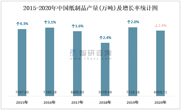 2015-2020年中國紙制品產量及增長率統計圖