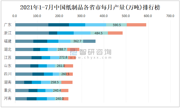 2021年1-7月中國紙制品各省市每月產量排行榜