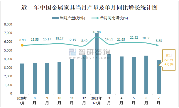根據國家統計局數據顯示:2021年7月中國金屬家具產量為3935萬件,同比增長8.83%;2021年1-7月中國金屬家具累計產量為27879.4萬件,同比增長23.98%;2015-2020年中國金屬家具產量2018年跌至最低值,此后呈現遞增趨勢。