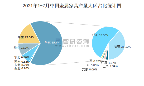 2021年1-7月中國金屬家具產量大區占比統計圖
