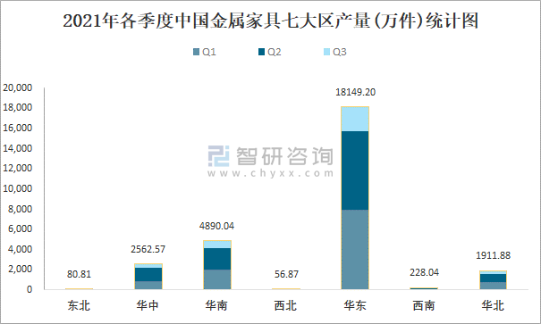根據國家統計局數據顯示:2021年各季度(第三季度暫只統計7月數據)中國金屬家具主要集中在華東、華南、華中地區生產;2021年1-7月中國金屬家具產量大區分布不均衡,其中華東地區產量最高,特別是浙江省貢獻了最多產量;2021年1-7月中國金屬家具各省產量呈現梯隊式分布,浙江、福建、廣東等省產量最多。