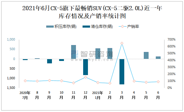 2021年6月CX-5旗下最暢銷SUV(CX-5二驅2.0L)近一年庫存情況及產銷率統計圖