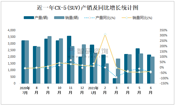 近一年CX-5(SUV)產銷及同比增長統計圖