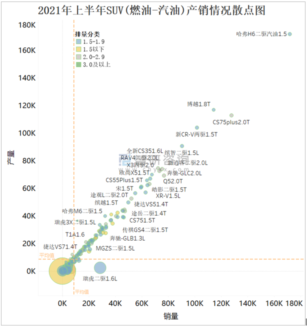 從下圖散點圖可看出,以產銷平均值作為四象限分界線,大部分燃油SUV集中在第一象限,即產多銷多,特別是哈弗H6二驅汽油1.5這款SUV,產量和銷量仍遙遙領先于其他燃油SUV;第三象限和第四象限SUV,其產銷率較高(散點大小代表了產銷率),說明大量產銷量不理想的SUV將庫存清理作為主要任務,銷量排名靠前的SUV,以1.5-1.9和2.0-2.9排量為主。