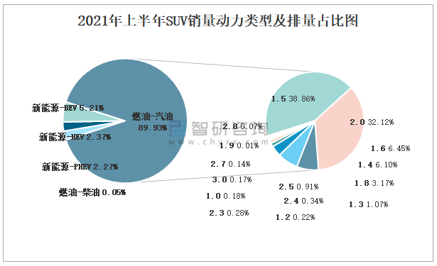 動力為燃油-汽油的SUV仍為銷售的主要車型,占比89.93%,其中1.5排量的燃油SUV較為暢銷;2021年上半年新能源-BEV的SUV銷售占比5.21%,是最暢銷的新能源SUV,其他兩款新能源PHEV、HEV的SUV也占有少量市場份額,相較于新能源轎車(BEV、PHEV、HEV三款新能源轎車2021年上半年銷量占有18.58%的市場份額),新能源SUV市場占有份額還有提升空間;隨著國家對新能源汽車政策扶持力度的加大、核心技術的升級、基礎設施的完善,未來新能源汽車將成為汽車產業轉型發展的主要方向。