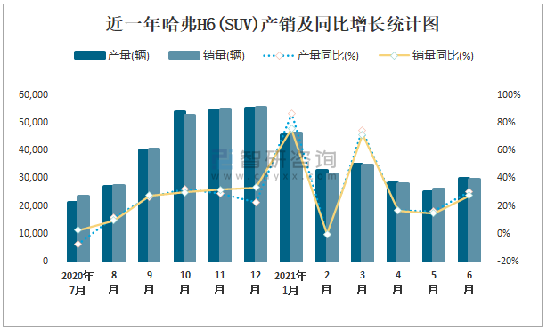 近一年哈弗H6(SUV)產銷及同比增長統計圖