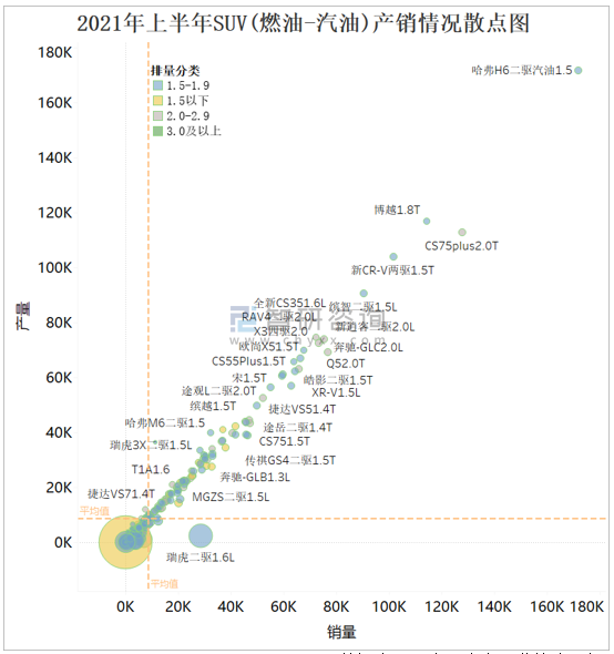 從下圖散點圖可看出,以產銷平均值作為四象限分界線,大部分燃油SUV集中在第一象限,即產多銷多,特別是哈弗H6二驅汽油1.5這款SUV,產量和銷量仍遙遙領先于其他燃油SUV;第三象限和第四象限SUV,其產銷率較高(散點大小代表了產銷率),說明大量產銷量不理想的SUV將庫存清理作為主要任務,銷量排名靠前的SUV,以1.5-1.9和2.0-2.9排量為主。