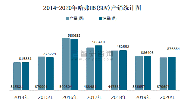 2014-2020年哈弗H6(SUV)產銷統計圖