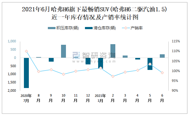 2021年6月哈弗H6旗下最暢銷SUV(哈弗H6二驅汽油1.5)近一年庫存情況及產銷率統計圖