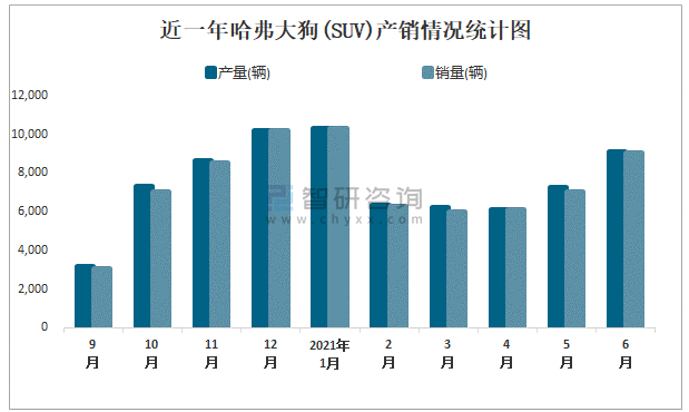 近一年哈弗大狗(SUV)產銷情況統計圖