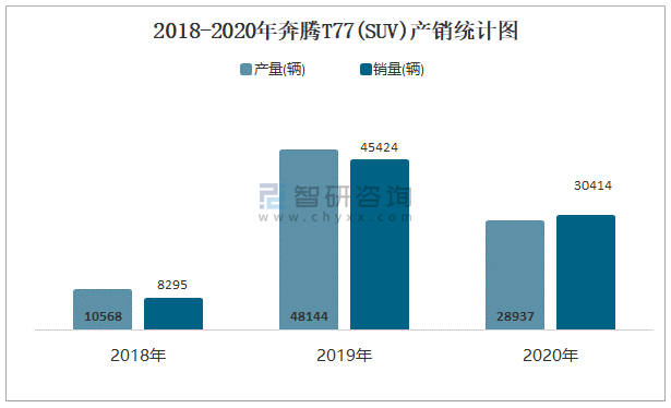 2018-2020年奔騰T77(SUV)產銷統計圖