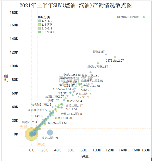 從下圖散點圖可看出,以產銷平均值作為四象限分界線,大部分燃油SUV集中在第一象限,即產多銷多,特別是哈弗H6二驅汽油1.5這款SUV,產量和銷量仍遙遙領先于其他燃油SUV;第三象限和第四象限SUV,其產銷率較高(散點大小代表了產銷率),說明大量產銷量不理想的SUV將庫存清理作為主要任務,銷量排名靠前的SUV,以1.5-1.9和2.0-2.9排量為主。