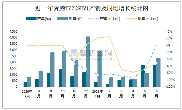 根據中國汽車工業協會數據可知:2021年6月奔騰T77(SUV)產量為1762輛,同比下降0%,銷量為2308輛,同比下降51.5%,當月產銷率為130.99%;2021年上半年奔騰T77(SUV)產量為5240輛,同比下降78.3%,銷量為8382輛,同比下降49.2%,產銷率為159.96%;2018-2020年奔騰T77(SUV)產銷量均在2019年達到最高值,此后有所下滑,且近3年總產量大于總銷量,積壓了庫存3516輛。