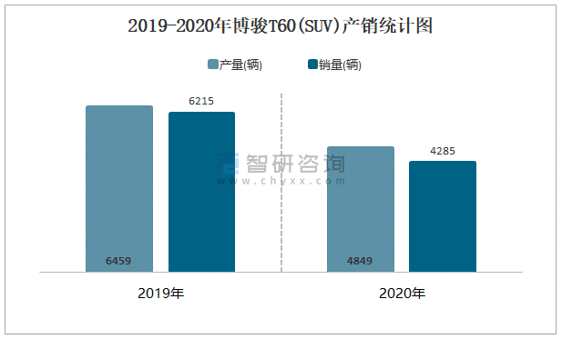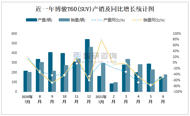 根據中國汽車工業協會數據可知:2021年6月博駿T60(SUV)產量為153輛,同比下降44%,銷量為175輛,同比下降48.2%,當月產銷率為114.38%;2021年上半年博駿T60(SUV)產量為1152輛,同比下降56.7%,銷量為1406輛,同比下降43.8%,產銷率為122.05%;2019-2020年博駿T60(SUV)產銷量有所縮減,且近2年總產量大于總銷量,積壓了庫存808輛。