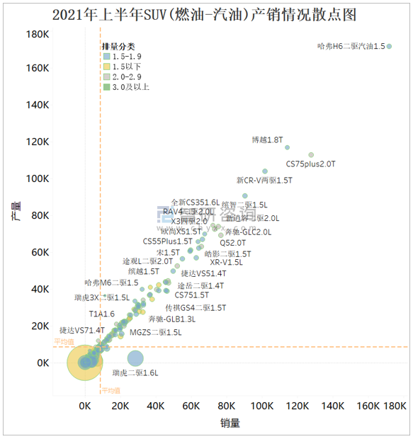 從下圖散點圖可看出,以產銷平均值作為四象限分界線,大部分燃油SUV集中在第一象限,即產多銷多,特別是哈弗H6二驅汽油1.5這款SUV,產量和銷量仍遙遙領先于其他燃油SUV;第三象限和第四象限SUV,其產銷率較高(散點大小代表了產銷率),說明大量產銷量不理想的SUV將庫存清理作為主要任務,銷量排名靠前的SUV,以1.5-1.9和2.0-2.9排量為主。