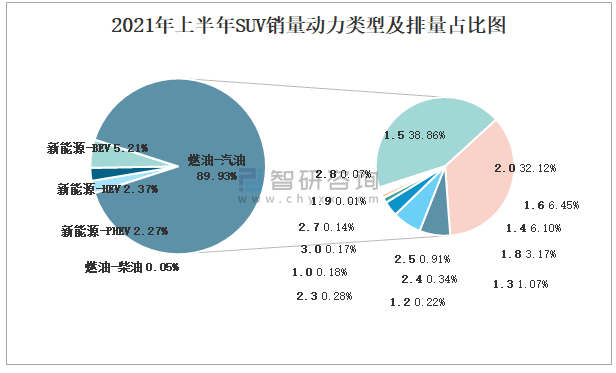 動力為燃油-汽油的SUV仍為銷售的主要車型,占比89.93%,其中1.5排量的燃油SUV較為暢銷;2021年上半年新能源-BEV的SUV銷售占比5.21%,是最暢銷的新能源SUV,其他兩款新能源PHEV、HEV的SUV也占有少量市場份額,相較于新能源轎車(BEV、PHEV、HEV三款新能源轎車2021年上半年銷量占有18.58%的市場份額),新能源SUV市場占有份額還有提升空間;隨著國家對新能源汽車政策扶持力度的加大、核心技術的升級、基礎設施的完善,未來新能源汽車將成為汽車產業轉型發展的主要方向。