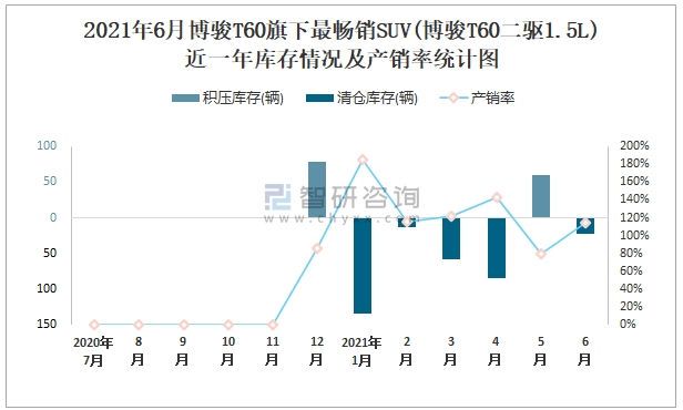 2021年6月博駿T60旗下最暢銷SUV(博駿T60二驅1.5L)近一年庫存情況及產銷率統計圖
