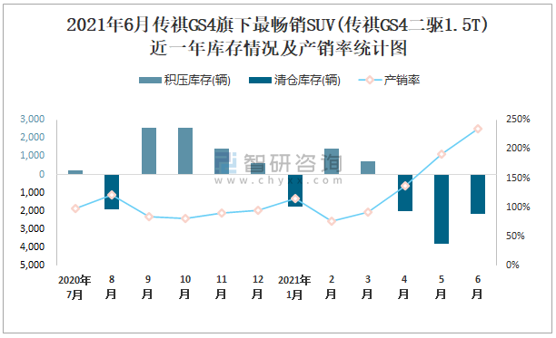 2021年6月傳祺GS4旗下最暢銷SUV(傳祺GS4二驅1.5T)近一年庫存情況及產銷率統計圖
