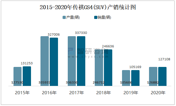 2015-2020年傳祺GS4(SUV)產銷統計圖