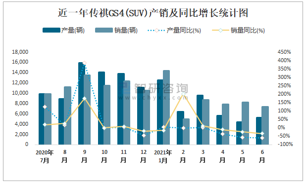 根據中國汽車工業協會數據可知:2021年6月傳祺GS4(SUV)產量為5217輛,同比下降60.3%,銷量為7356輛,同比下降34%,當月產銷率為141%;2021年上半年傳祺GS4(SUV)產量為43649輛,同比下降18.2%,銷量為51482輛,同比下降9.8%,產銷率為117.95%;2015-2020年傳祺GS4(SUV)產銷量均在2019年達跌至最低值,此后有所上升,且近6年總產量大于總銷量,積壓了庫存4495輛。
