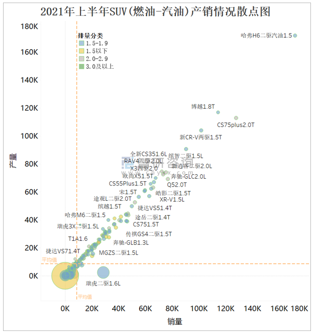 從下圖散點(diǎn)圖可看出,以產(chǎn)銷平均值作為四象限分界線,大部分燃油SUV集中在第一象限,即產(chǎn)多銷多,特別是哈弗H6二驅(qū)汽油1.5這款SUV,產(chǎn)量和銷量仍遙遙領(lǐng)先于其他燃油SUV;第三象限和第四象限SUV,其產(chǎn)銷率較高(散點(diǎn)大小代表了產(chǎn)銷率),說明大量產(chǎn)銷量不理想的SUV將庫存清理作為主要任務(wù),銷量排名靠前的SUV,以1.5-1.9和2.0-2.9排量為主。