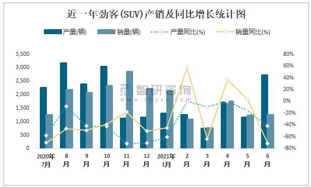 近一年勁客(SUV)產(chǎn)銷及同比增長統(tǒng)計(jì)圖