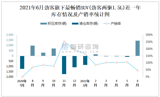 2021年6月勁客旗下最暢銷SUV(勁客兩驅(qū)1.5L)近一年庫存情況及產(chǎn)銷率統(tǒng)計(jì)圖
