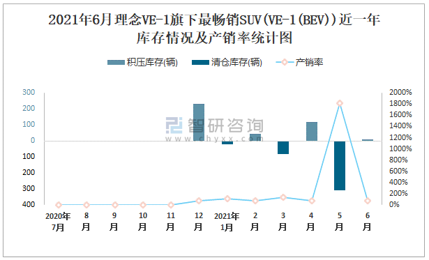 2021年6月理念VE-1旗下最暢銷SUV(VE-1(BEV))近一年庫存情況及產銷率統計圖