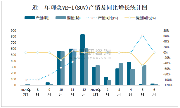 近一年理念VE-1(SUV)產銷及同比增長統計圖