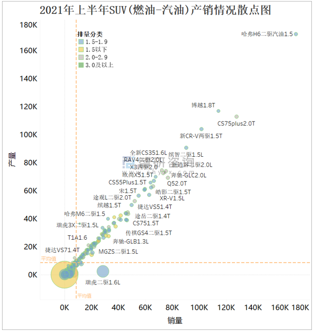 從下圖散點圖可看出,以產銷平均值作為四象限分界線,大部分燃油SUV集中在第一象限,即產多銷多,特別是哈弗H6二驅汽油1.5這款SUV,產量和銷量仍遙遙領先于其他燃油SUV;第三象限和第四象限SUV,其產銷率較高(散點大小代表了產銷率),說明大量產銷量不理想的SUV將庫存清理作為主要任務,銷量排名靠前的SUV,以1.5-1.9和2.0-2.9排量為主。
