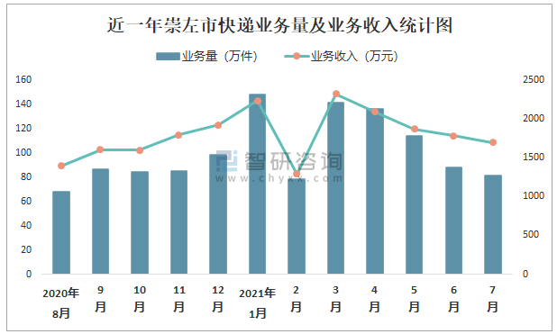 近一年崇左市快遞業務量及業務收入統計圖