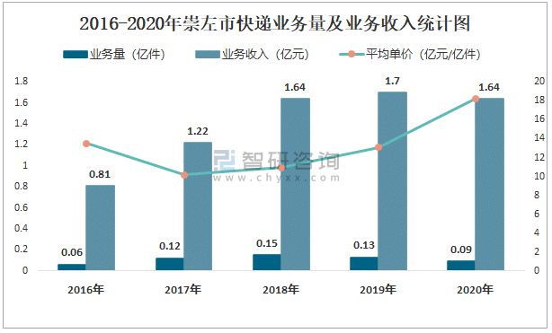 2016-2020年崇左市快遞業務量及業務收入統計圖
