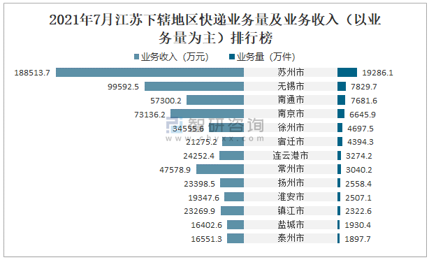 2021年7月江蘇下轄地區快遞業務量及業務收入(以業務量為主)排行榜