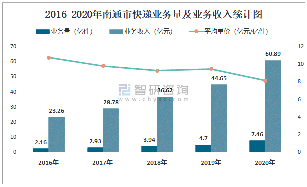 2016-2020年南通市快遞業務量及業務收入統計圖