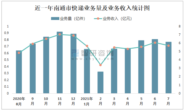 近一年南通市快遞業務量及業務收入統計圖