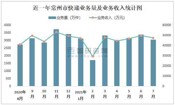 近一年常州市快遞業務量及業務收入統計圖