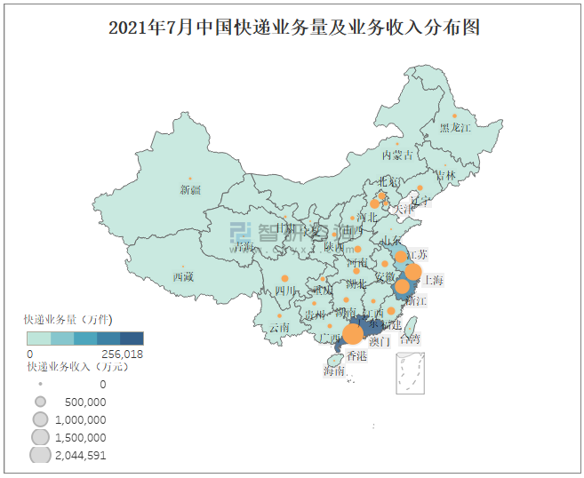 根據各省市郵政局數據可知:隨著我國電商行業的發展、國家政策的支持以及人們需求的增加等因素,驅動了快遞行業的快速發展;從2021年7月中國快遞業務量及業務收入分布圖可以看出,各省市快遞業務量及業務收入分布不均勻(以顏色深淺表示業務量大小,以圓點大小表示業務收入的多少),沿海地區相比內陸地區快遞業務量及業務收入明顯較多,其中廣東省和浙江省快遞業務量和業務收入遠超過其他省市。
